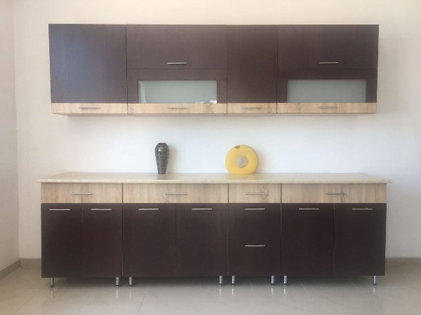 Dimensiune : L - 260 cm In componenta intra: Pentru baza :Masca de chiuveta de 80 cm; Un corp de 80 cm; Un corp de 60 cm; Un corp de 40 cm. Pentru partea suspendata : 2 corpuri de 80 cm; Un corp de 60 cm; Un corp de 40 cm. |